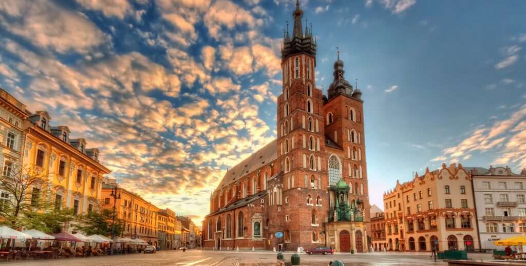 En primer lugar, la Plaza del Mercado (Rynek Główny) se presenta como el corazón vibrante de Cracovia. Considerada una de las plazas medievales más grandes de Europa, despliega un escenario majestuoso de arquitectura gótica, renacentista y barroca. Desde sus arcadas y terrazas, se observa la vida cotidiana desarrollarse con la misma cadencia que hace siglos. Además, la Basílica de Santa María domina el horizonte con sus torres desiguales y su famoso retablo tallado, una obra maestra del arte sacro europeo.