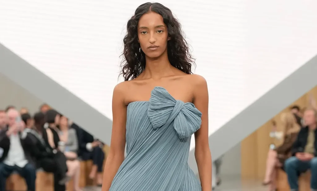 La colección mezcló prendas estructuradas, como capas de lana, abrigos voluminosos y siluetas con hombros, con piezas livianas, como vestidos de seda, transparencias y faldas plisadas.
