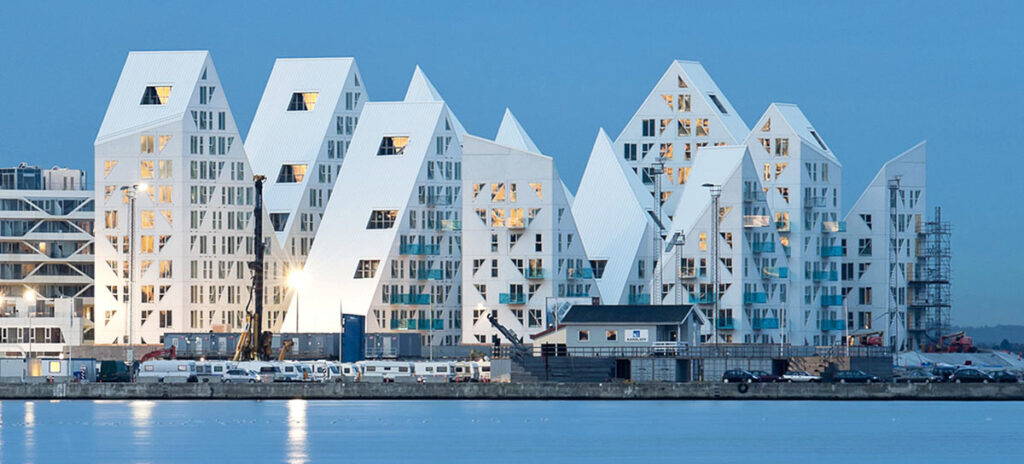 En el corazón del nuevo distrito portuario de Aarhus Ø, en Dinamarca, se levanta un conjunto residencial que parece emerger del mar: Isbjerget, conocido como El Iceberg. Su perfil dentado, su color blanco brillante y los balcones de vidrio azul evocan la imagen de un bloque de hielo flotando junto al agua. Además, su diseño está pensado para que todas las viviendas disfruten de luz natural y vistas hacia la bahía, reflejando una filosofía arquitectónica centrada en la convivencia con el entorno.