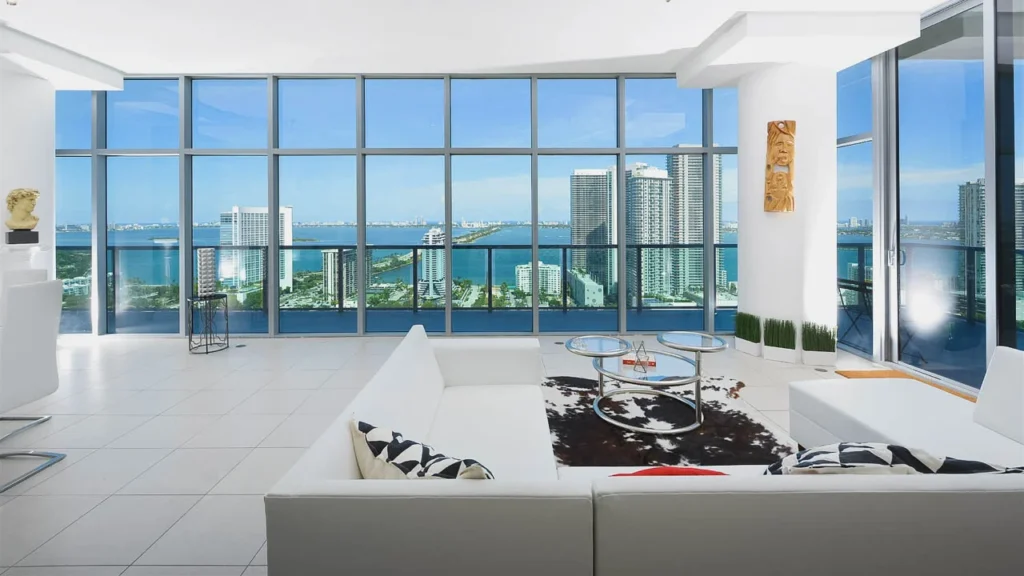 El penthouse ocupa uno de los pisos superiores del edificio y ofrece más de 350 metros cuadrados de superficie. Desde sus amplios ventanales de suelo a techo se despliegan vistas panorámicas de la Bahía de Biscayne y del skyline de Miami, un espectáculo cambiante que acompaña tanto amaneceres luminosos como atardeceres intensamente dorados.