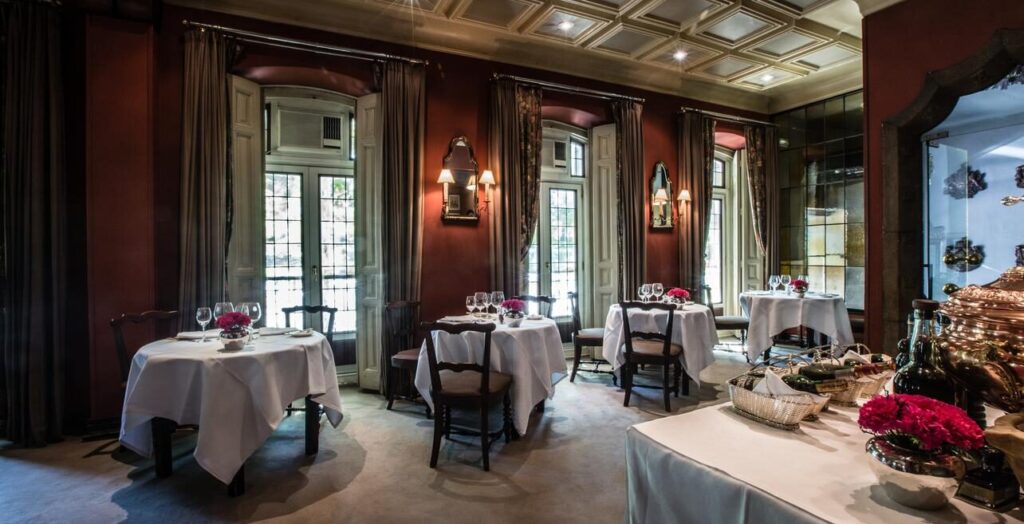 El interior del restaurante, con salones íntimos, maderas nobles, porcelanas y luz tenue, transmite una atmósfera de serenidad y exclusividad.