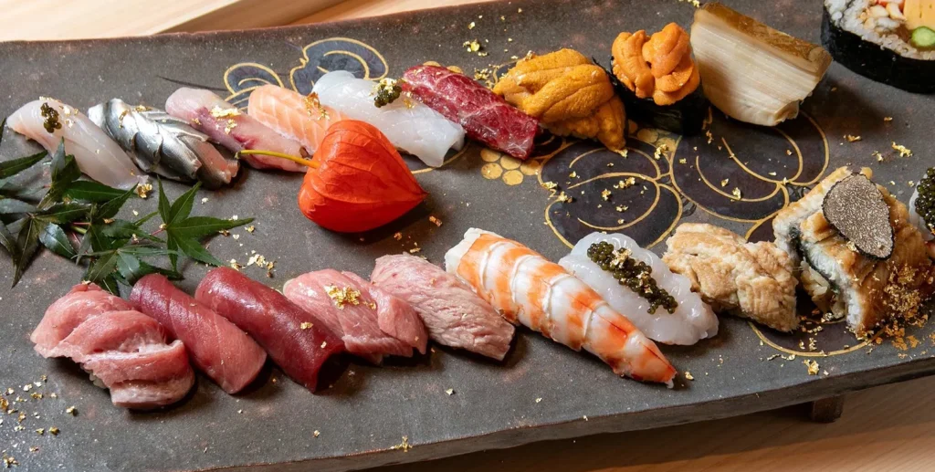 Aunque el número de piezas puede variar según la temporada, el menú incluye alrededor de 20 nigiris de edición limitada, cada uno elaborado con ingredientes imposibles de encontrar en restaurantes convencionales. Entre ellos destacan caviar beluga premium, uni (erizo de mar) Murasaki y Bafun, camarón botón de Hokkaido, carne de ballena del Atlántico Norte, trufa negra europea, setas matsutake, abalon al vapor y cortes de atún azul en sus tres niveles de grasa (akami, chutoro y otoro). Para reforzar la opulencia, algunas piezas se coronan con láminas de oro comestible de 24 quilates, un gesto que convierte el nigiri en una auténtica joya efímera.