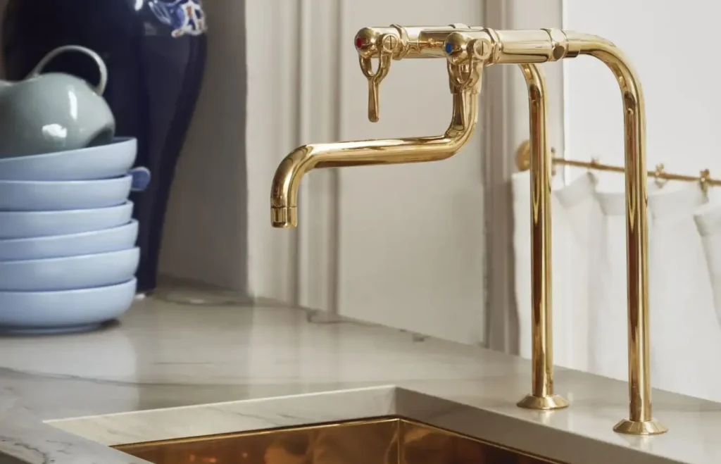 En decoración de lujo, el acabado lo es todo. Por eso, la grifería abandona los cromados tradicionales en favor de superficies ricas y sofisticadas. Los acabados mate —negro, blanco o titanio— dominan el mercado por su elegancia y capacidad de integrarse en cocinas contemporáneas. Al mismo tiempo, los metales cálidos como el latón cepillado, el cobre o el oro rosado aportan un toque de glamour clásico reinterpretado.