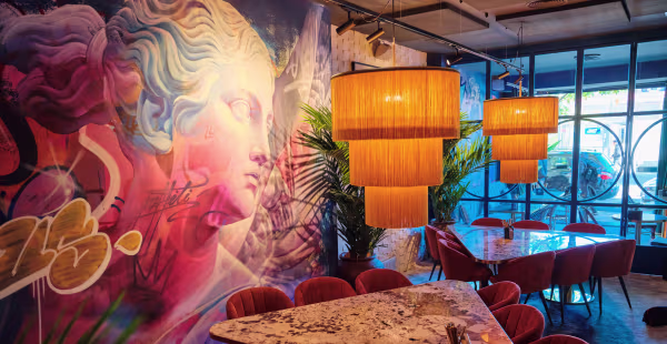 Para empezar, el espacio impacta. Un interiorismo de inspiración artística, con murales de aire urbano, vegetación abundante, detalles en mármol y una iluminación cálida, crea un ambiente envolvente y muy fotogénico. Además, el diseño juega con contrastes: toques industriales, guiños clásicos y una paleta de colores intensos que refuerzan la sensación de exclusividad sin caer en la rigidez.