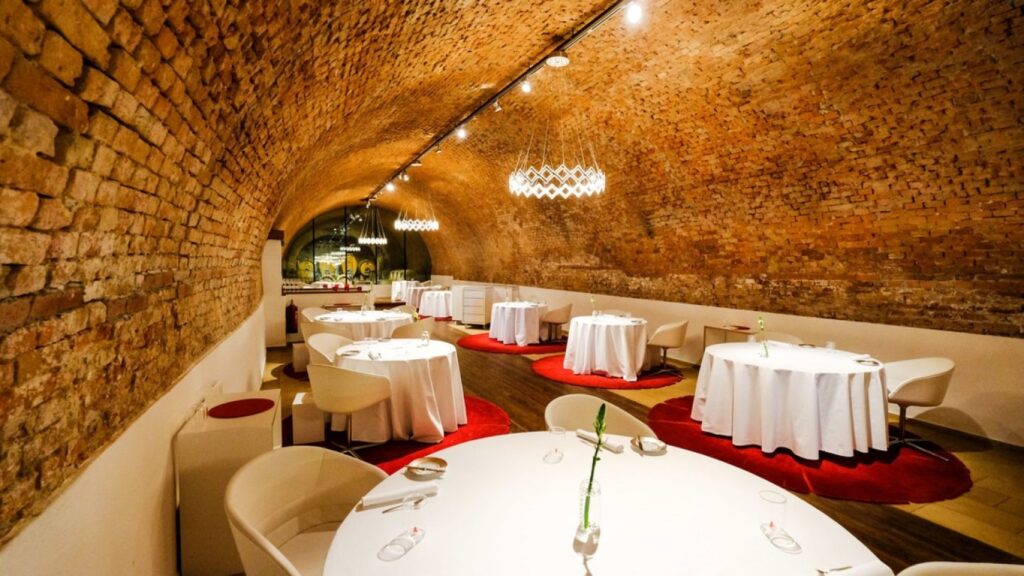 Por otro lado, el espacio físico también contribuye a la experiencia. El restaurante se encuentra en una antigua bodega vinícola en Grinzing, cuyo interior de ladrillo y bóvedas históricas se mezcla con un diseño moderno y sofisticado.